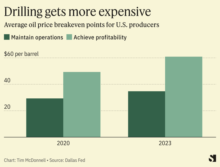 Oil producers are being squeezed by rising operational costs, and the falling oil price — $70 per barrel for West Texas Intermediate on Friday — is pushing dangerously close to the breakeven point for U.S. companies, according to the Dallas Fed.