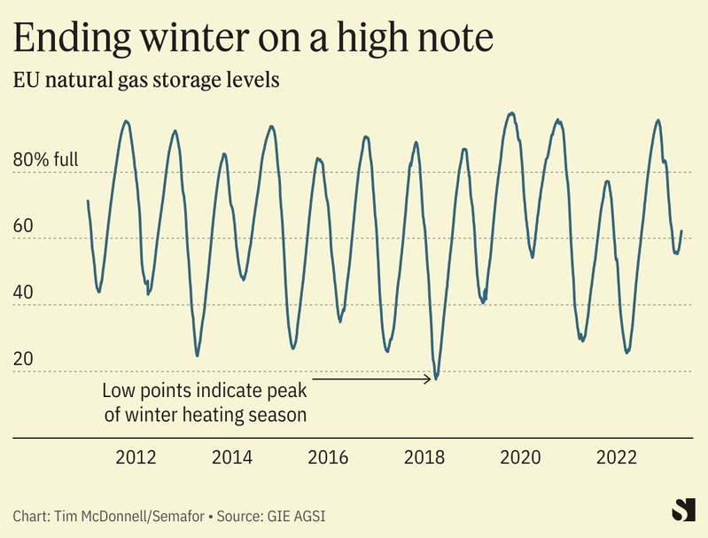 Falling gas prices — about a tenth of the peak last summer — are a signal that Europe’s full court press to replace Russian pipeline gas with U.S. LNG imports and renewables is working. The EU is aiming to fill 90% of its gas storage capacity ahead of the winter, in anticipation of further Russian cuts. The falling price may counterintuitively complicate that goal: Gas purchases are now slowing as buyers try to hold out for even lower prices.