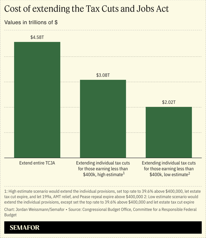 The Biden team has vowed to pay for the cost of preserving the Trump tax cuts for households making below $400,000. But it won’t be cheap: Depending on the proposal’s details, that alone could cost anywhere from $2 trillion to $3 trillion, according to an analysis for Semafor by the Committee for a Responsible Federal Budget.