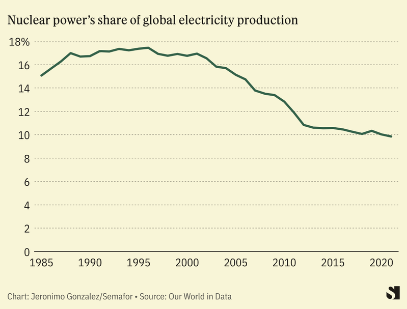 The share of global electricity production from nuclear power has been falling for the past 30 years.