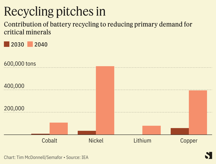 Unlike the fossil fuels we currently rely on, we won’t be burning the minerals that will underpin the greener economy of the future. So not only can we recycle them, we must: A recent Johns Hopkins University study concluded that the mineral production expected by 2030 falls massively short of projected demand by the U.S. and its main trading partners. Eighty times more graphite is needed, 10 times more lithium, 30 times more cobalt, and twice as much nickel. If China and other suppliers are counted too, lithium and cobalt supply would still meet only half of global demand by 2030, the International Energy Agency projects.
