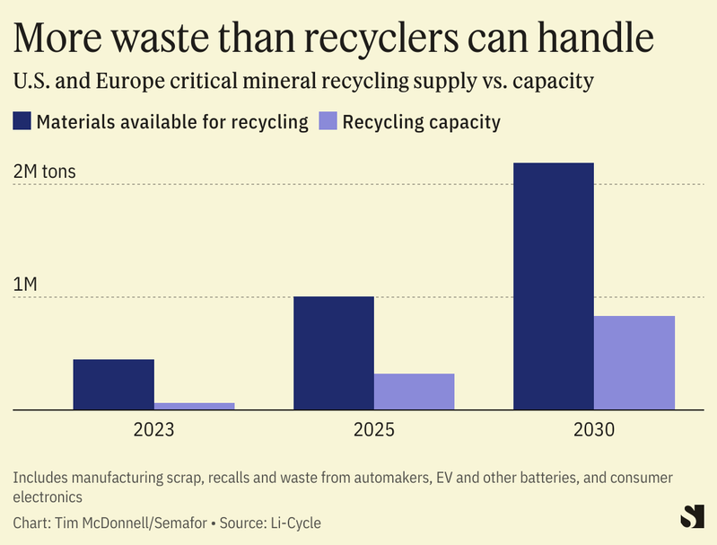 In fact, as Tesla and others continue to build battery “gigafactories” in the U.S. and Europe, the recycling industry will be overwhelmed with material, according to Li-Cycle projections. Automakers themselves are helping the industry catch up. Li-Cycle has a partnership with General Motors. Another recycling startup called Redwood, founded by a former Tesla executive, has raised more than $1 billion from partnerships with Ford Motor, Toyota, Volkswagen, and Volvo.