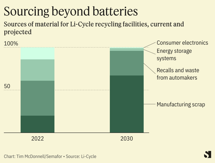 Companies like Aqua aren’t waiting for the deluge of old EVs to start scaling up. They’re already able to tap into existing waste streams, including scrap from battery manufacturers, as their feedstock. Toronto-based Li-Cycle won a $375 million loan from the U.S. Department of Energy in February to build a recycling facility in New York, supplementing four existing facilities in the U.S. and Canada. For now, battery manufacturing scrap and waste from automaker factories are the main sources of supply. Once more EV batteries start to flow in, the company expects its New York facility could become one of the largest sources of lithium in the U.S.