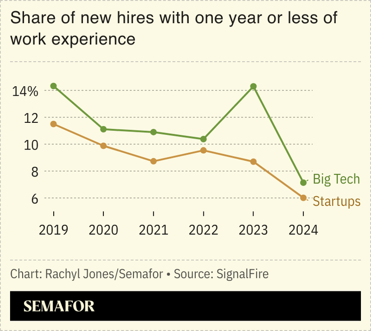 Big Tech and startups are hiring roughly half as many early career workers as a share of their total new hires, compared to just before the pandemic. Instead, “companies are posting lower-level roles and hiring more experienced [individuals] to fill them,” the report said.