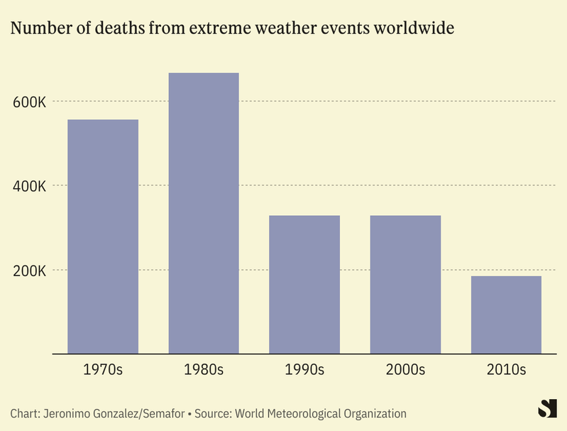 Extreme weather causes more damage, but fewer deaths, than it used to. Storms, droughts, and other such events cost the world nearly $1.5 trillion in the 2010s, compared to $183 billion in the 1970s, according to the World Meteorological Organization.