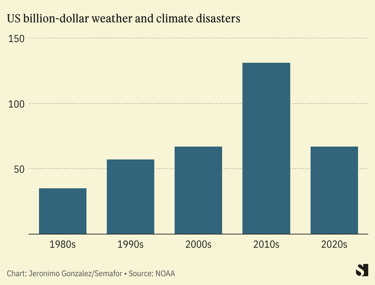 The cost of those disasters, however, has risen quickly. That’s largely because, as the world gets richer, there are more valuable things to destroy. In the 1980s in the U.S., for instance, there were 35 weather and climate disasters that cost more than a billion dollars. By the 2010s, that figure had risen to more than 130. And now, just a few years into the 2020s, that figure is already at 67.
