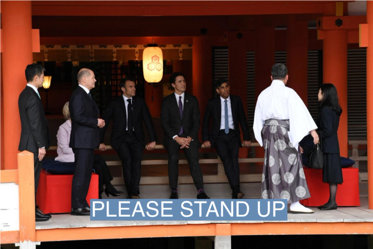One of the viral photos, posted by Ken Moriyasu, a correspondent for Nikkei Asia in Tokyo, shows French President Emmanuel Macron, Canadian Prime Minister Justin Trudeau, and British Prime Minister Rishi Sunak perching on a guardrail at the shrine while the Chief Priest, Motoaki Nozaka, speaks to them.