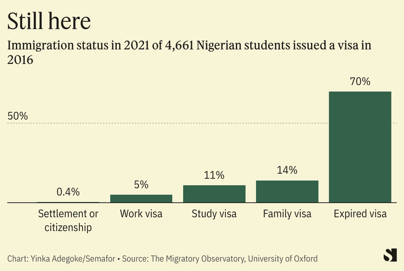 Tiamiyu apologized on his YouTube channel after a social media backlash in which he was accused of betraying Nigerians but the points he made ring true — for Nigerians who can afford it, studying in Britain and taking family offers a path out of Nigeria. Figures from Britain’s Home Office analyzed by Semafor Africa back up the trend. It shows that five years after graduation a larger proportion of Nigerians who arrived on a student visa remained in Britain on work visas.
