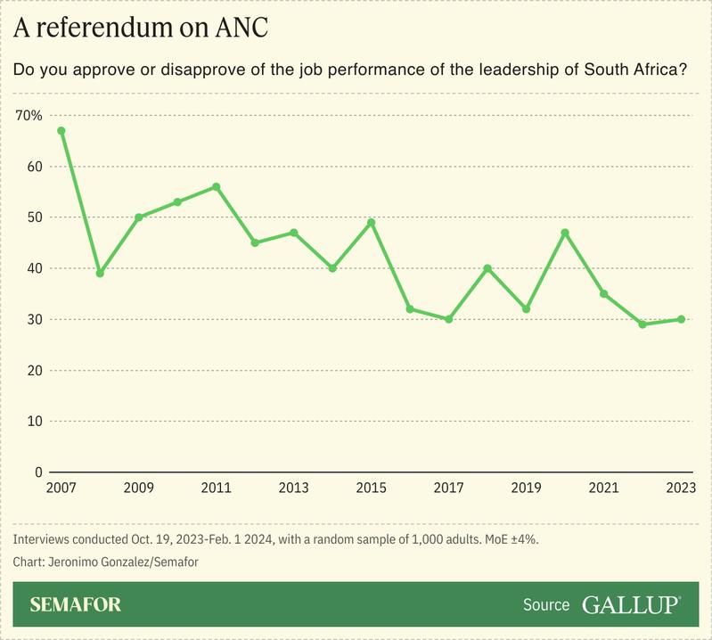 “I don’t see the ANC’s vote collapsing in the way others have predicted,” Naidoo told Semafor Africa. “The ANC will still emerge as the largest party and if it gets 46% of the vote or above, it will be business as usual.”