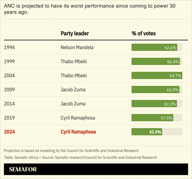 The uMkhonto weSizwe Party (MK Party) is on course to be the third biggest party. Dudu Zuma, a member of MK’s leadership committee and the former president’s daughter, told Semafor Africa the party would “definitely not” enter a coalition with the ANC if Ramaphosa led it or with the main opposition Democratic Alliance (DA).