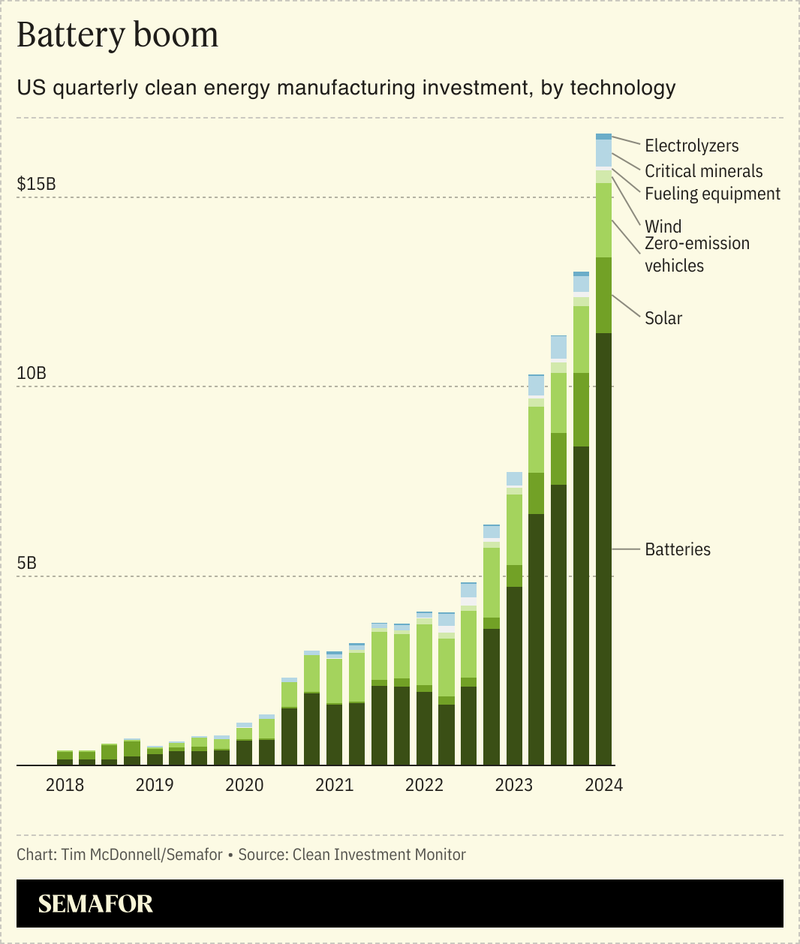 A new report from the Rhodium Group think tank this week showed that funds are pouring into battery factories as automakers and other major battery customers look to take advantage of tax bonuses for domestic content. In the first quarter of this year, battery manufacturing investment reached a record $11.4 billion, more than double the total investment in other cleantech sectors combined.