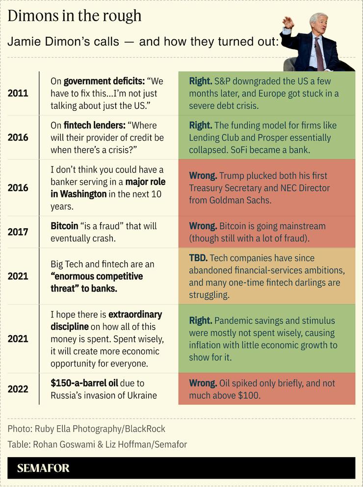 Wall Street’s longest-serving and most outspoken CEO does indeed have a long list of prognostications — 24 years of shareholder letters will do that — but his record is better than Bessent is giving him credit for. Where he’s been wrong over the years, he’s mostly been too gloomy, though his conservatism may help explain why JPMorgan has weathered successive financial crises better than any other bank.
