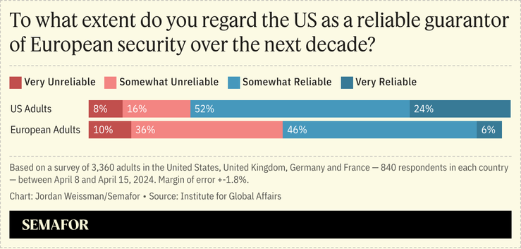 The survey of 3,360 people, conducted by the Institute for Global Affairs housed at the Eurasia Group, found that 46% of Western Europeans — respondents from the UK, Germany, and France — view the US as somewhat reliable in its security commitments, while another 36% rate the US as somewhat unreliable and 10% believe the US cannot be relied on at all to protect Europe in the next decade.