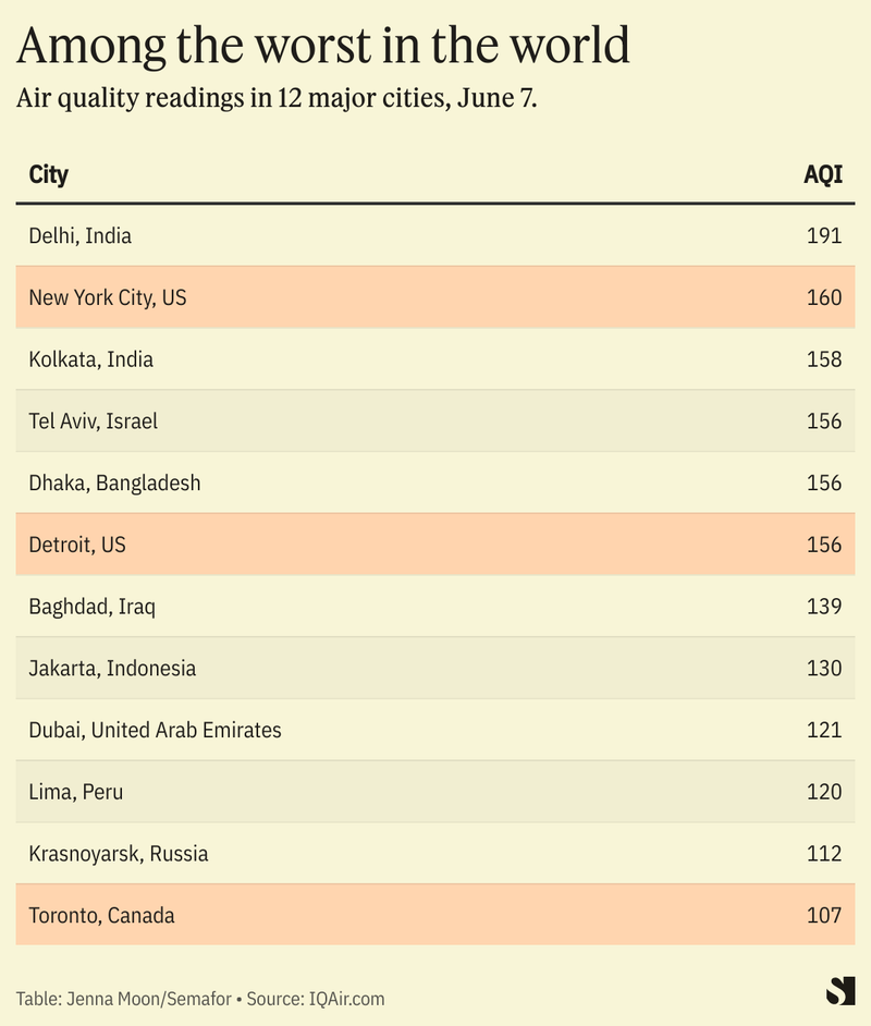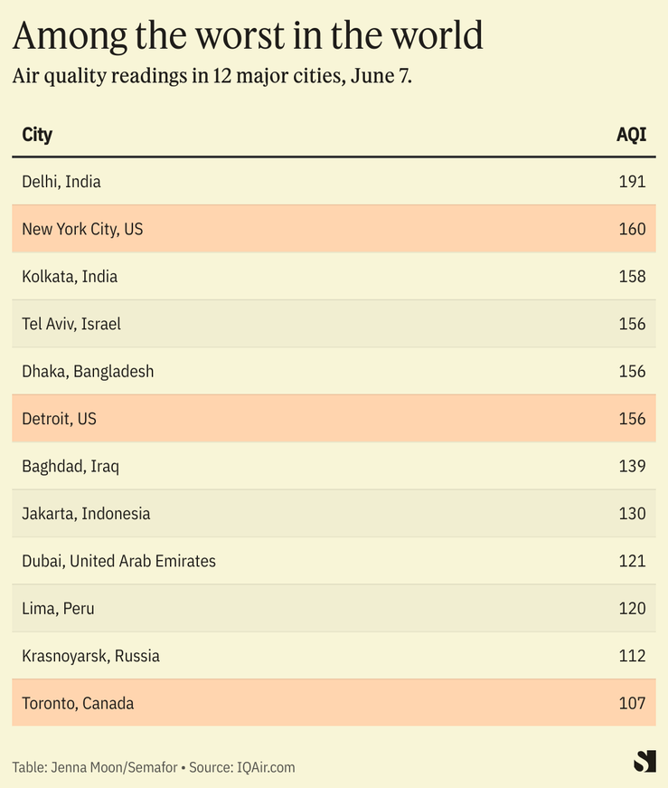 Millions of residents across the U.S. and Canada are under air quality warnings, and as of early Wednesday the air quality in New York City was the second-worst in the world, according to IQAir.com. New York measured a 160 on the U.S. Air Quality Index (AQI), 14.5 times higher than the World Health Organization’s annual guideline. In Detroit, the AQI was 156, and in Toronto, it measured at 107, or 7.4 times more than the WHO guidelines.