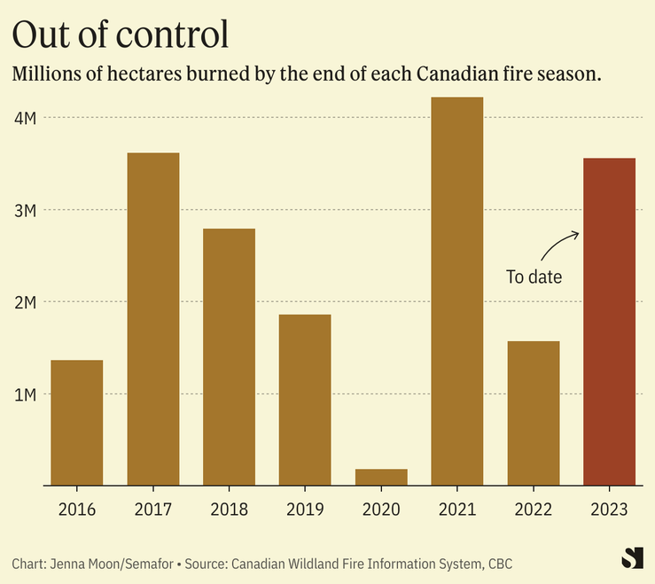 Canada is on track to have one of its most destructive fire seasons in recent years. According to estimates by the Canadian Wildland Fire Information System, more than 3.5 million hectares of land have burned as of June — around 10 times higher than would be normal for the month — and almost on par with the entirety of the 2017 fire season.