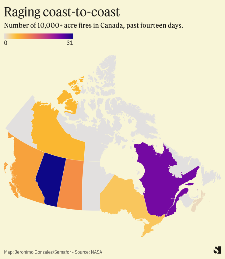 Fires are burning from coast to coast, with Quebec and Alberta among the hardest-hit provinces. As of Wednesday, around 160 fires were burning in Quebec — Canada’s second most-populous province — and Alberta faced another 64. Around 10,000 people were evacuated from their homes in Quebec, though that number is falling as some fires come under control.