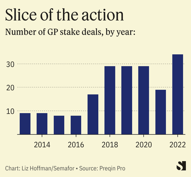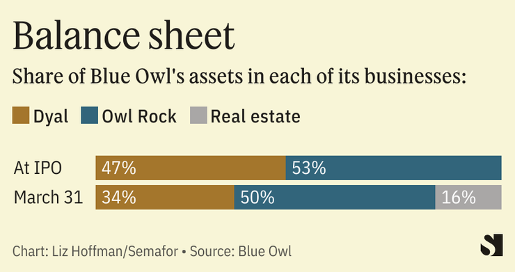 At the time, Dyal and Owl Rock managed roughly $25 billion each, making for a balanced firm. Both have since grown, but Owl Rock’s business of making corporate loans has expanded faster, and the acquisition of a real-estate firm in 2021 further tilted the balance.
