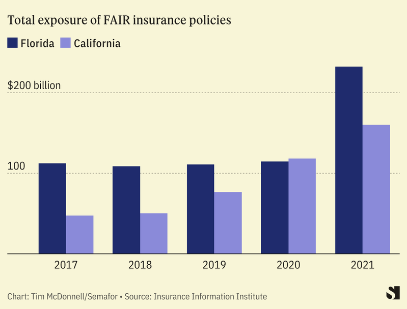 When private insurance is not available, most states, including California, offer so-called Fair Access to Insurance Requirements (FAIR) plans, also known as “last resort” plans, that are overseen by the state but financed by a pool of private insurers. Participation in these plans is skyrocketing nationally; since 2017, the combined value of homes covered by these plans has jumped 70%, to more than $500 billion.