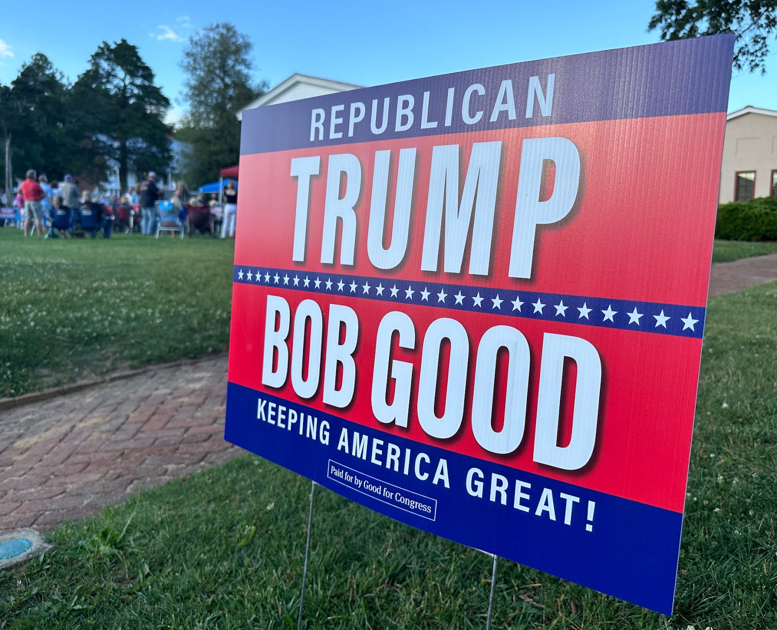 Good’s campaign hadn’t played along. On Friday, Powhatan’s courthouse lawn was surrounded by campaign signs that looked, until further examination, like endorsements: “Republican TRUMP/ BOB GOOD/ Keeping America Great!” (A couple walking past me and the rally speculated that Trump had chosen a running mate named “Bob Good.“)