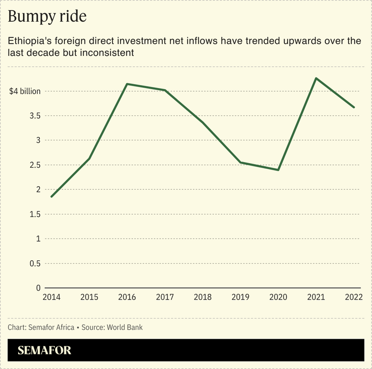 Ethiopia’s industrialization strategy has focused on attracting foreign direct investment. A push in recent years to attract investment led to the landlocked nation being one of the continent’s top recipients of foreign direct investment. Chinese investment in the country, which tripled in 2021 from the previous year, played a major role.