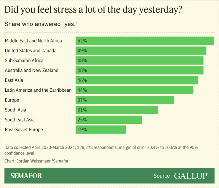 While most employees around the world reported feeling stressed, the feeling can vary significantly depending on how organizations are run, Gallup CEO Jon Clifton wrote in the introduction to the report. When a company’s poorly managed, employees are almost 60% more likely to feel stressed than when a company has good management. The current strategies companies adopt to address stress may also be ineffective, Clifton added. He cited a 2024 Oxford University study, which found that solutions like stress management training and wellbeing apps are not making an impact on employees. A better approach would be to change the way people are managed at the organizational level, instead.