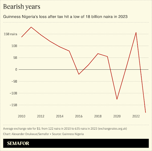 The deal comes on the back of the Nigerian company’s recent bumpy performance in the last decade as the naira weakened sharply against the dollar. Guinness Nigeria’s loss after tax exceeded 18 billion naira (about $28 million) last year. A decade ago, its profit of 9.5 billion naira was worth over $58 million.