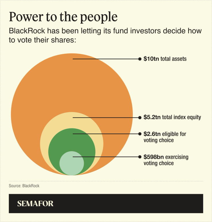 And it’s been rolling out the ability for individual investors in its fund to vote for themselves. “The money BlackRock manages is not our own—it belongs to our clients—and BlackRock is committed to providing clients around the world with choices to support their unique and varied investment objectives,” the company said in its dropout letter to Climate Action in February.
