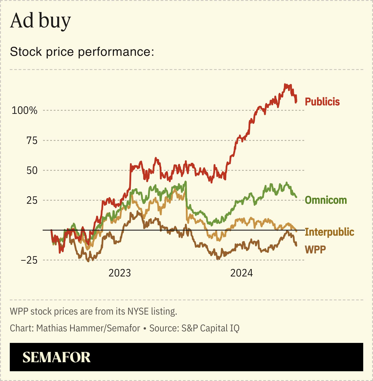 Now, six years later, Publicis appears to have delivered on its promise. The company’s stock performance has separated dramatically from its peers since 2020, a shift that reflects its success winning clients and an industry confidence it can keep doing that. Dentsu and the other key companies in the space find themselves chasing the Groupe.