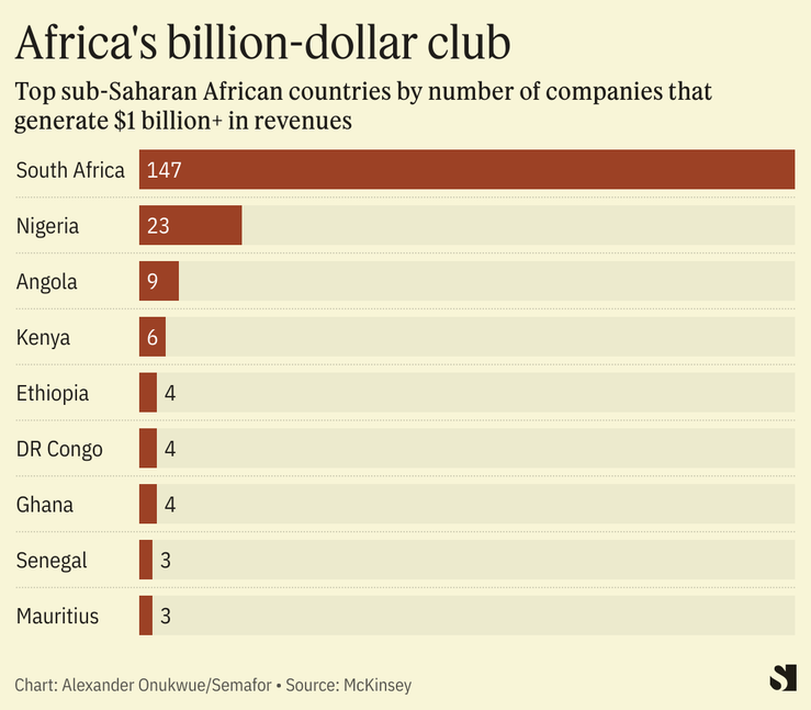Out of the 345 companies in Africa that each generate $1 billion or more in annual revenues, 230 were started in an African country and the founder is often an African, according to a report by McKinsey. South Africa is by far the continent’s leader with 40% of all the billion-dollar revenue companies. Its large companies increased revenues at an average rate of 5.5% a year between 2015 and 2021, while large companies in other countries saw average declines by 1.7% in the same period.
