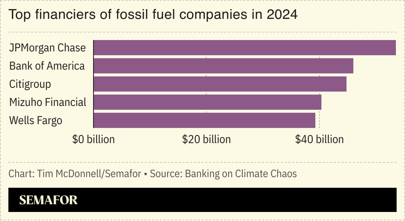 A spokesperson for JPMorgan said the bank is “one of the world’s largest financiers to both traditional and clean energy companies,” and that a better way to understand its energy finance activities is to look at the ratio between the two, which currently stands at about $1.29 for clean energy for every $1 supporting fossil fuels. A Citi spokesperson also said the bank “supports the transition to a low-carbon economy” and is working toward a goal to invest $1 trillion in sustainable enterprises. Spokespeople for the other top fossil fuel banks declined to comment.