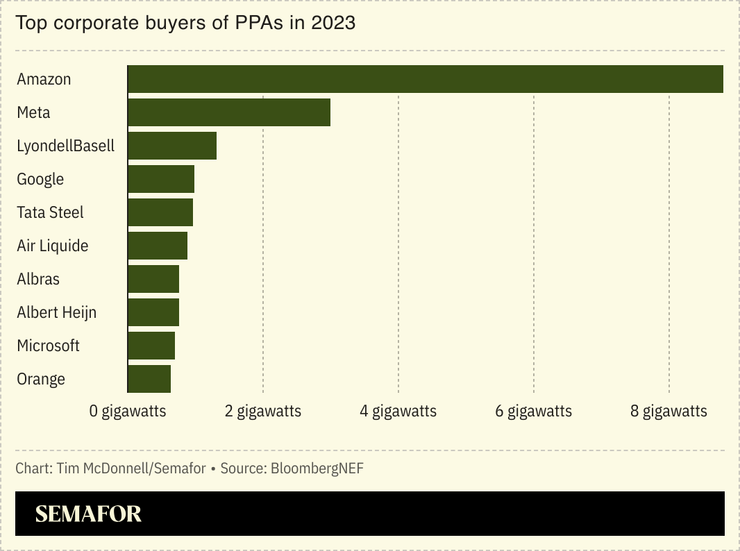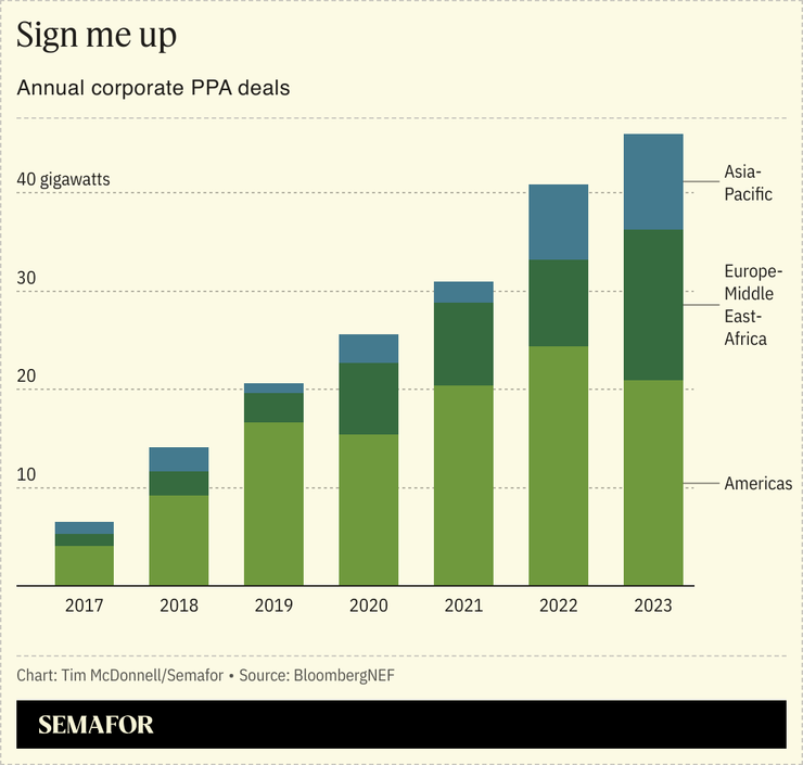 In a typical corporate PPA, a company signs a 15-20 year purchase agreement with a solar or wind farm developer. In most cases, the buyer isn’t actually taking power directly from the plant, but is technically buying only a certificate representing the power’s zero-carbon attributes; the power itself flows into the local grid and can’t be counted against anyone else’s carbon footprint. These deals make new projects bankable that otherwise wouldn’t be, and they’re one of the only ways for a company to jump ahead of whatever its utility is willing or able to do to decarbonize. They are also typically structured so that if the prevailing daily price of power falls below the fixed rate in the PPA, the buying company will get paid back the difference, which for Google and other buyers has become an important side stream of revenue. In 2023, companies globally, mostly in Big Tech, signed a record 46 gigawatts of PPAs, according to BloombergNEF, equivalent to the overall power output of 100 midsize coal plants.