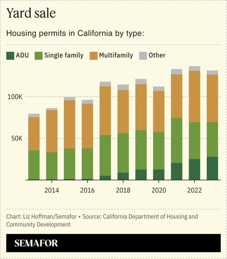 Applications for ADUs in California, one of the nation’s most strapped housing markets and the epicenter of the grimy politics associated with it, have risen 20-fold since 2016. About one-quarter of the 110,000 housing permits the state approved last year were for ADUs. States including Colorado, Maine, New Jersey, and Vermont have all taken up or passed laws that would change zoning laws to make it easier to build backyard dwellings. Last week, San Jose became the first city to let owners turn their ADUs into condos and sell them separately.