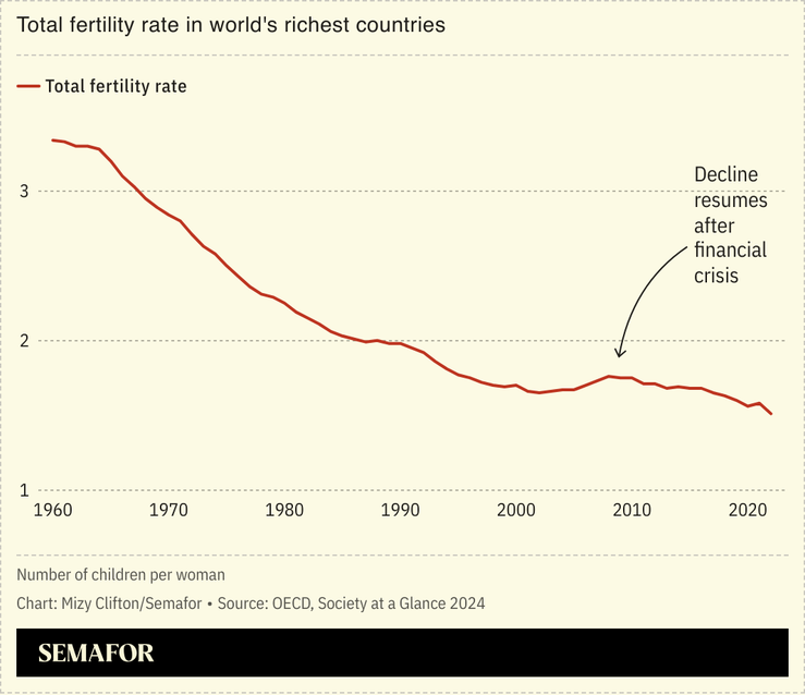 Birth rates in the world’s richest economies have more than halved since 1960 to well below the “replacement level” of 2.1 children per woman in all 38 OECD countries except Israel, according to a new study.