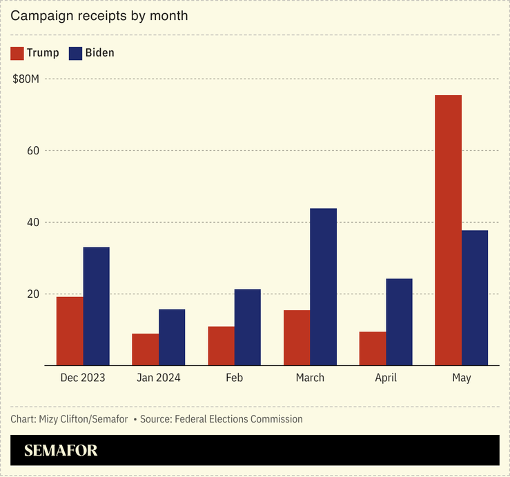 The staggering rise in Trump’s funds in May “has the potential to dramatically reshape the presidential race,” The Washington Post noted. This comeback could allow the former president to further grow his operation and air more TV ads, an area in which Biden has so far outpaced him. One Democratic strategist told The New York Times that while the surge in funds for Trump was a cause for concern for Democrats, Biden still had room to run “a really strong campaign” — though the full picture of the financial strength of each campaign will only become clear at the end of the summer, the Post added.