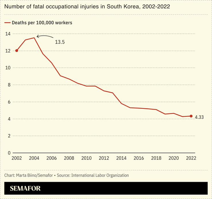 South Korea remains one of the countries with the highest industrial death rates in the world, the Financial Times wrote, with over 600 reported fatal incidents in 2023. Leading companies like Samsung and Hyundai have faced disputes over their health and safety measures. The government has made efforts to improve safety, with the passing of a law in 2021 that holds company executives accountable for deaths caused by lax enforcement of safety rules, leading to potential fines that could reach $800,000 or imprisonment for up to a year.