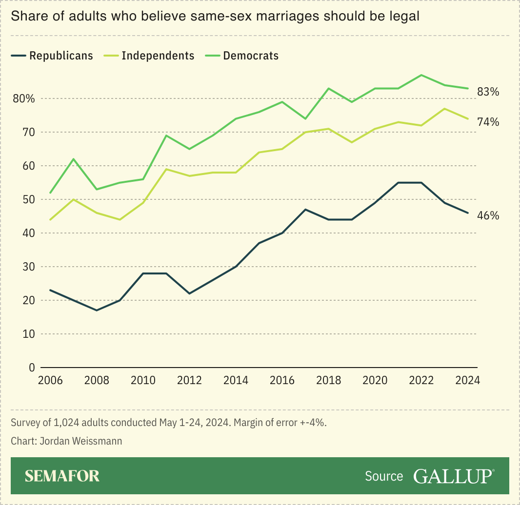 But there are stark differences between the parties: 83% of Democrats and 75% of independents continue to back it, with support relatively steady among both groups. But the share of Republicans in favor has fallen to 46%, after hitting all-time highs of 55% in 2021 and 2022.