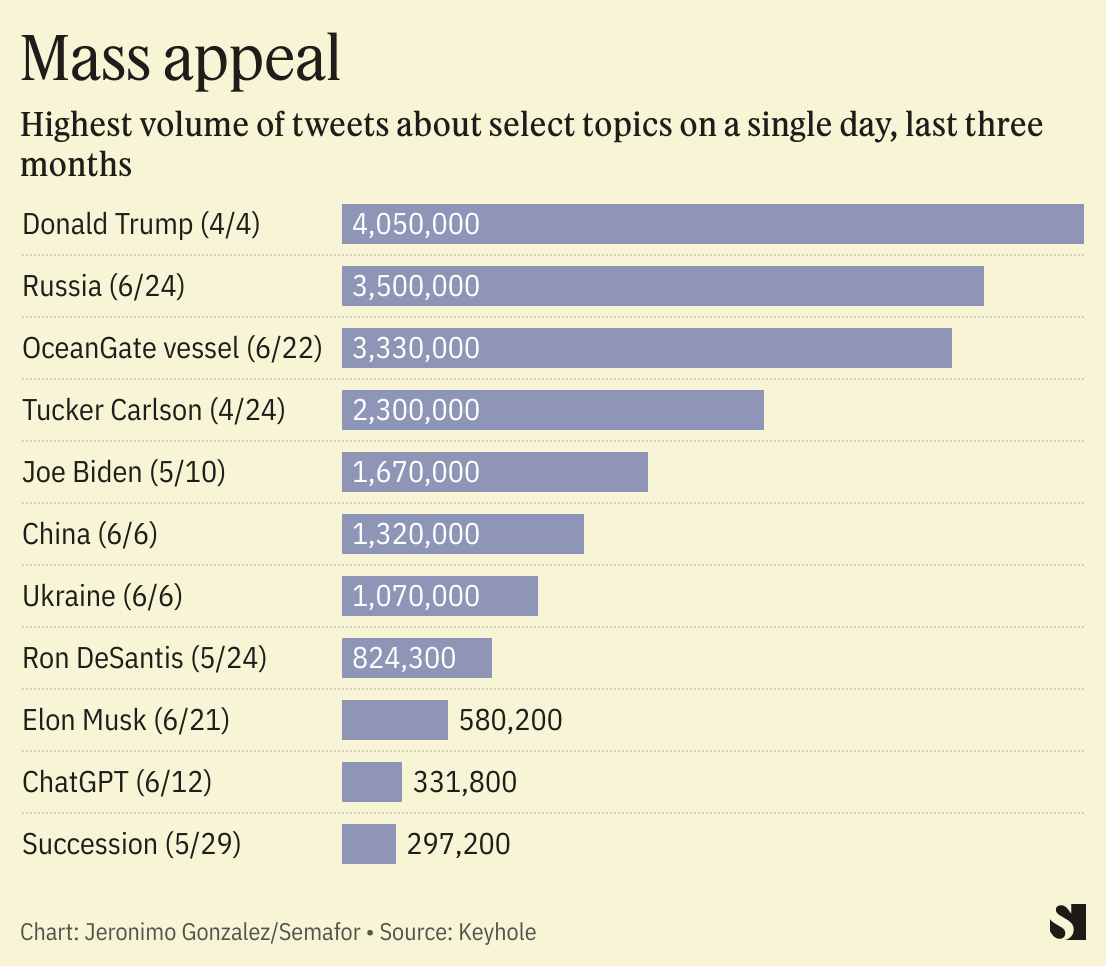 An ongoing, unresolved storyline with a mixture of high stakes, high uncertainty and endless space for commentary is a lane that is mostly filled with live sports and elections. On a less predictable cadence, we saw it at the beginning of COVID, with the 2021 Gabby Petito case, and even over the last few days for the Wagner Group’s 24-hour rebellion, as doubts grew about Vladimir Putin’s hold on power.