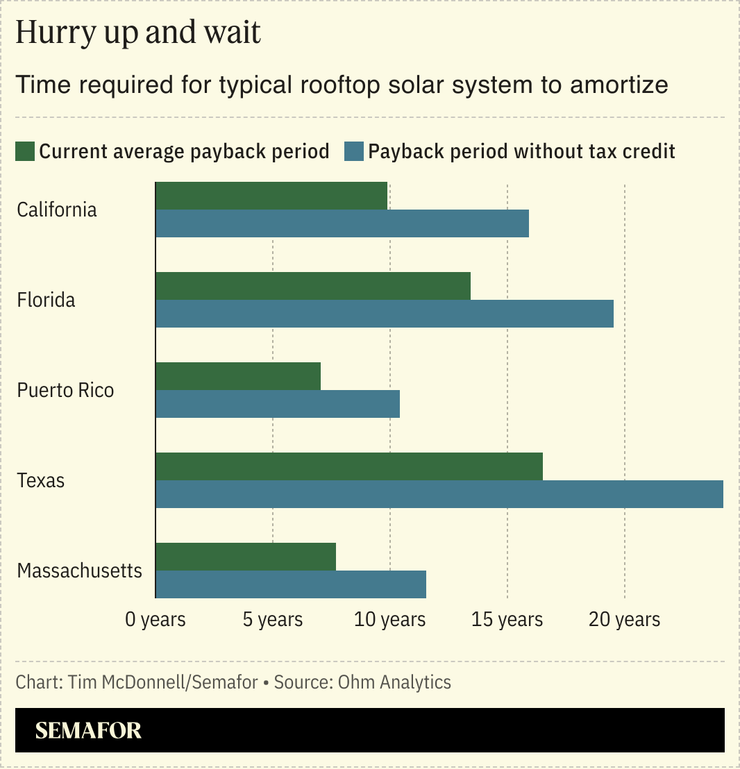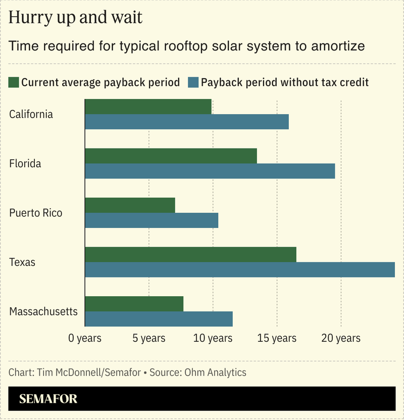 Plans to kill the tax credit by the end of the year would be tantamount to a death sentence for much of the residential solar industry and bring major layoffs, Ben Airth, policy director at Freedom Forever, told Semafor. The Senate is expected to vote on the “One Big Beautiful Bill” as soon as this week, legislation that would scale back many tax benefits for clean energy, but hit rooftop solar especially hard. Analysts project that the measure would cause the amount of rooftop solar installed in the US to fall in 2026 by more than half compared with its 2024 level.
