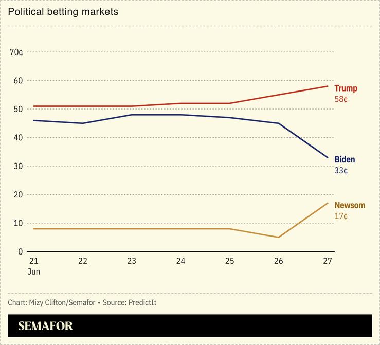 Before either candidate took the stage, more than 60% of Democrats said they would prefer a different nominee. Trump didn’t come out of that poll unscathed — 54% of Republicans said the same of him — but Biden’s Thursday performance is likely to further widen the gap between the candidates. A CNN flash poll found 67% of debate watchers said former President Trump performed better, compared to 33% who said Biden won. And while polls tend to show which party or candidate voters would prefer to win, political bookmakers are backing their opinions with money, a YouGov pollster told Flutter: By the end of the debate, political betting market PredictIt gave Trump a 61% chance of winning, up from 53% at the start.
