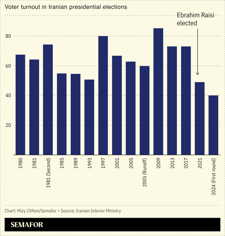 Iranian elections serve to demonstrate the continuity and functionality of the regime, an expert at UK-based think tank Chatham House told Semafor. Supreme Leader Ayatollah Ali Khamenei tried to boost turnout by saying that “any vote [would] be a vote to the Islamic Republic.” But after the vote, some said that the low turnout was a “silent referendum” against the establishment, and even hardline pundits speculated as to why public trust seemed eroded, AI-Monitor’s Tehran correspondent noted. The lackluster numbers suggest most Iranians don’t see elections “as a meaningful path to change,” an expert told Eurasia Review. However, that Pezeshkian received a million more votes than his opponents may suggest people still have faith in the reformist camp, a Bloomberg columnist wrote