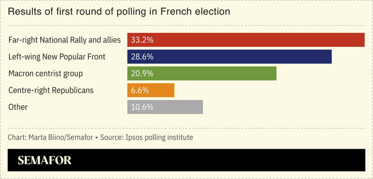 The outcome of the first round of voting has “introduced elements of instability that have been unheard of since the birth of the Fifth Republic” in 1958, a Le Monde columnist argued. The president is now unable to guarantee the functioning of the political system, and the system is not representing many of the voters, some who feel “scorned or ignored,” she wrote. The election as a whole, The Economist noted, plunged the country into “uncharted territory.” A government led by National Rally, as well as one led by the left-wing alliance New Popular Front, could mean “extremist politics, economic populism and financial instability.”
