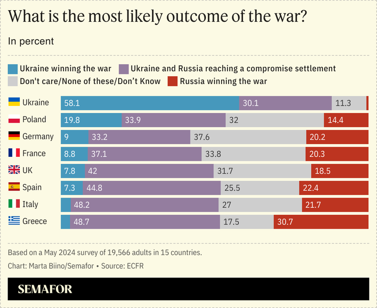 A survey of almost 20,000 people living in 15 European countries showed that support for Ukraine has remained largely unchanged since the war’s beginning. In the countries surveyed, Europeans support Kyiv, while in Ukraine, “morale is strong.” But they diverge on what sending weapons to Ukraine can possibly achieve: “Ukrainians want more weapons and ammunition to help them win the war, most Europeans want… to put Kyiv in a better negotiating position to end the war,” the think tank found. Another point of disagreement: Ukraine sees potential membership of NATO and the European Union as a “recognition of their bravery,” while other Europeans see potential membership as part of a future settlement.