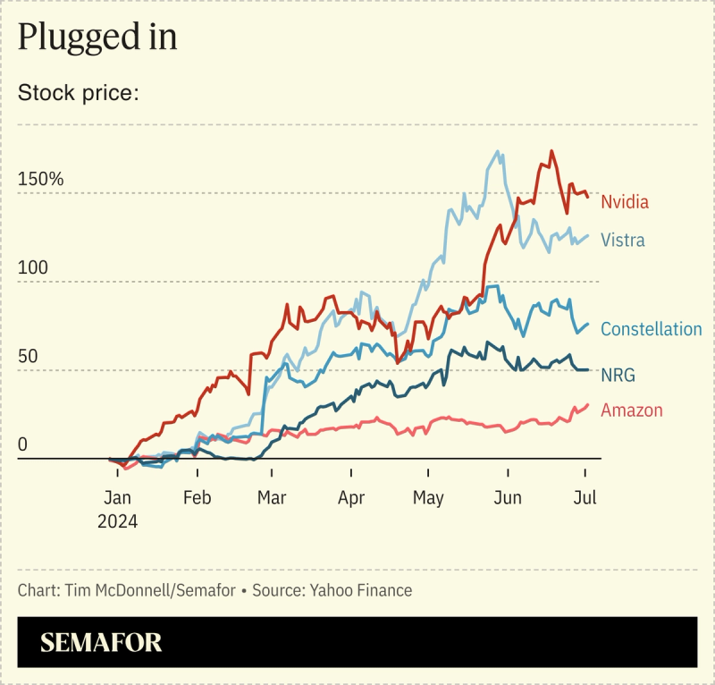 The utilities sector beat the S&P 500 index in the second quarter, with Vistra and Constellation Energy among the top five performing stocks so far this year (along with Nvidia, GE, and the data center company Supermicro), while NRG Energy is the year’s 11th-best.