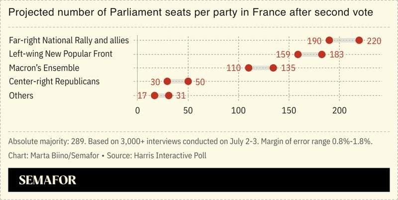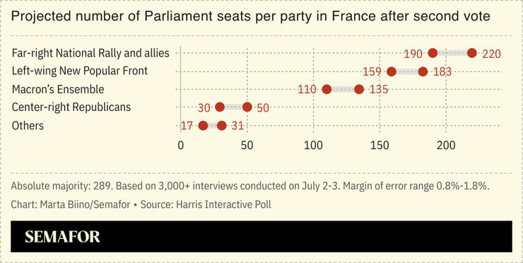A Harris Interactive poll suggests Marine Le Pen’s National Rally and its allies will win between 190 and 220 parliamentary seats — short of the 289 needed for an absolute majority.