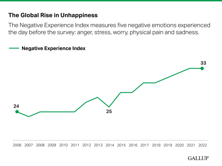 Over the past decade, while the global economy grew, government and business leaders missed the other big trend: the global rise in unhappiness. According to Gallup’s Negative Experience Index, negative emotions around the world have been increasing since 2014.