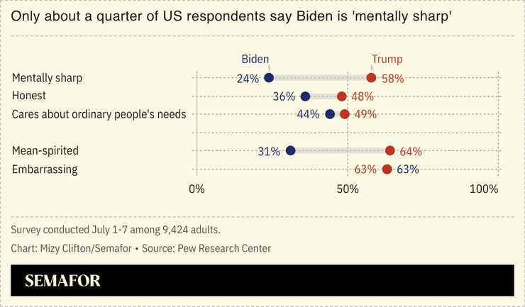 The Pew survey found that 63% of voters describe both Biden and Trump as embarrassing. Only about a quarter (24%) of voters said they consider Biden “mentally sharp” — down from 53% in 2021 — while 58% said they would describe Trump that way.