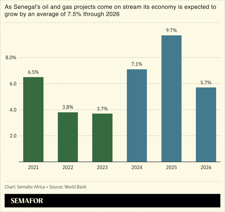 Senegal’s economy grew by 4.3% in 2023, a larger rate than the year before, while inflation dropped by nearly 4 percentage points from a record high of 9.7% in 2022, according to the World Bank. The oil and gas projects coming on stream this year could grow Senegal’s economy by an average of 7.5% a year between 2024 and 2026.