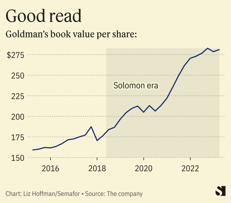 Defending the firm in recent weeks, Goldman’s communications chief Tony Fratto has pointed to the stock price, which is holding steady in the low to mid $300 range. That’s true, and Solomon has steadily grown book value.