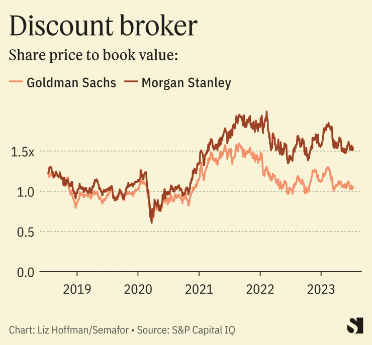 Goldman trades at a widening discount to its closest peer, Morgan Stanley, whose CEO, James Gorman, is in the final year of a model tenure. Morgan Stanley’s acquisitions have paid for themselves and the firm is now Wall Street’s steadiest performer, largely drama-free in both its financial results and its internal workings.