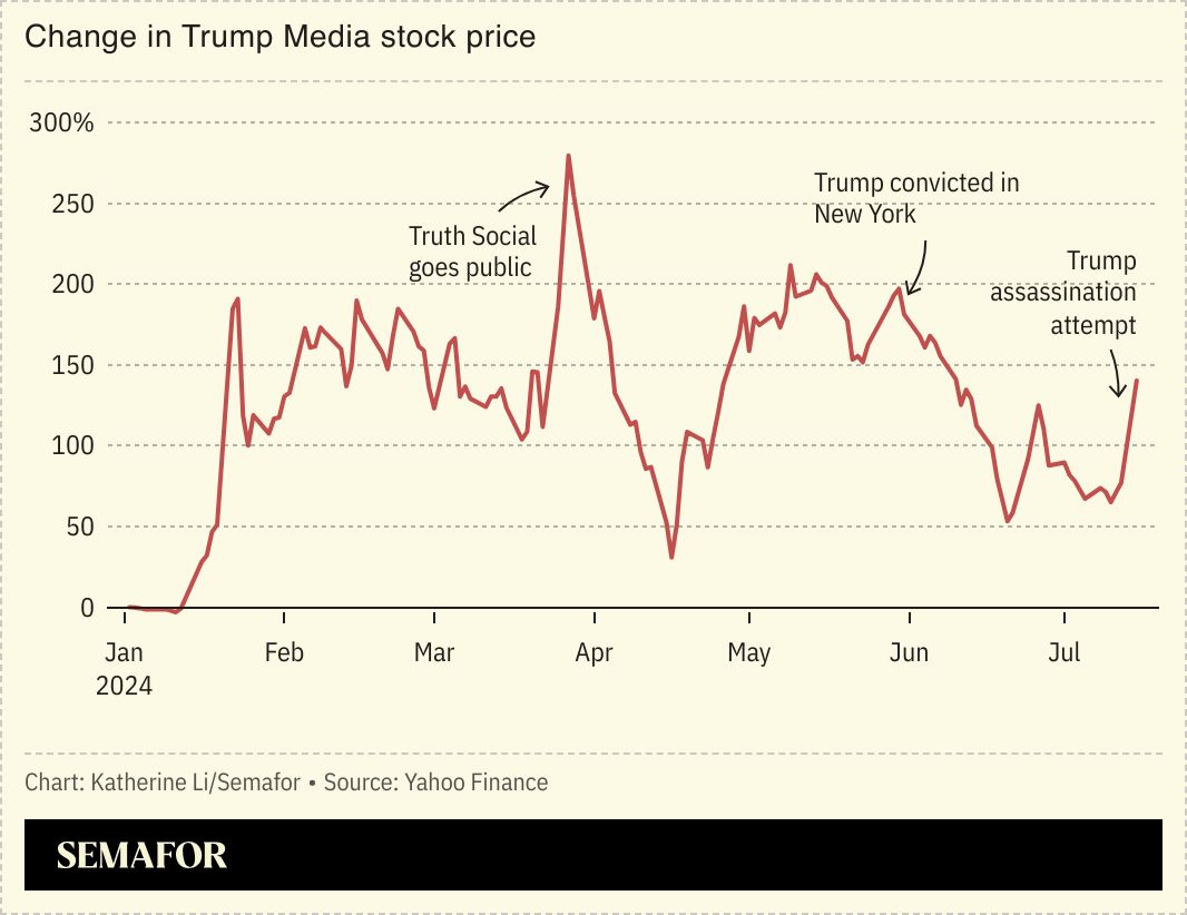 Global markets reacted to the attempted assassination of Donald Trump with a surge of bets that could pay off if the former US president wins in November. Shares of Trump Media rose 30%; the price of bitcoin reached its highest level in two weeks; and South Korean defense and nuclear energy stocks climbed. It’s based on “anticipation that the Republican’s return to the White House would usher in tax cuts, higher tariffs and looser regulations,” Bloomberg wrote.